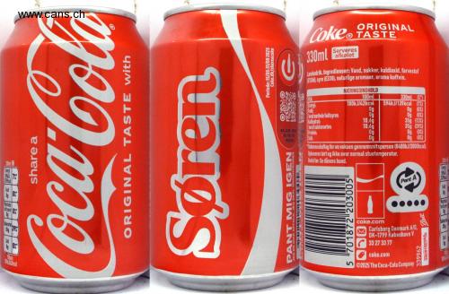 330ml Energi 594 72 139kcal Fedt Salt Og Senate 35g ettsyrer Or FERR 0% 100ml: 18/42kcal share a ORIGINAL TASTE with Periode: 15/05-31/08 2025 Coke.dk/shareacoke Coke 330ml ORIGINAL Ⓡ TASTE Serveres afkølet Læskedrik. Ingredienser: Vand, sukker, kuldioxid, farvestof E150d), syre (E338), naturlige aromaer, aroma koffein. NÆRINGSINDHOLD 100ml 330ml (%) PER: 180kJ/42kcal 594kJ/139kcal (7%) Energi: Fedt: Og Og (0%) heraf mættede fedtsyrer: Og Og (0%) Kulhydrat: 10.6g 35g (13%) heraf sukkerarter: 10.6g 35g (39%) SCAN MIG Protein: Og Og (0%) OG VIND FE Salt: Og Og (0%) PRAMIER PANT MIG IGEN JEG ER IKKE AFFALD. JEG SKAL GENANVENDES Referenceindtag for en voksen gennemsnitsperson (8400kJ/2000kcal). Opbevares tørt og ikke over normal stuetemperatur. Bedst før: Se dåsens bund. 5 701872 203005 Energ Pant A 5940 139c Fedt Mattede fedtsyre Ball Og Sukkerarte 35g coke.com Carlsberg Danmark A/S, DK-1799 København V 33 27 33 77 coke.com 2025 The Coca-Cola Company 16D51BF08A 339962 180JACE 13555