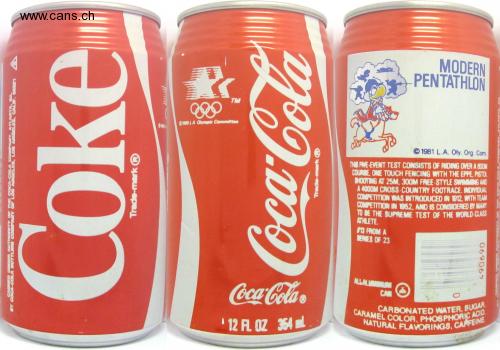 CARAMEL COLOR, PHOSPHORIC ACID. NATURAL FLAVORINGS, CAMFEINE CARBONATED WATER, SUGAR MODERN PENTATHLON マ TM Oroeo LA Olypic Commirtee 1981 L.A. Oly. Org. Com. THIS FIVE-EVENT TEST CONSISTS OF RIDING OVER A 60OM COURBE, ONE TOUCH FENCING WITH THE EPPE, PISTOL SHOOTING AT 25M, 300M FREE-STYLE SWIMMING AND A 4000M CROSS-COUNTRY FOOTRACE. INDIVIDUAL COMPETITION WAS INTRODUCED IN 1912, WITH TEAM COMPETITION IN 1952, AND IS CONSIDERED BY MANY TO DE THE SUPREME TEST OF THE WORLD-CLASS ATHLETE. rO FROM A DENIES OF 23 ALLAL UM Coca-Cola CAM ' 12 A. 0Z 354 ml CAMMED UDER AUUTHORITY OF THE C OCA-COLA COPAY, ATLARTA, GA Trade-mark Trade-mark 069067