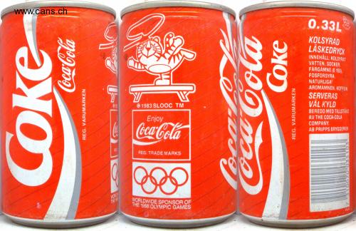 0.33L CARBONATED SOVERY DRINK CONTENTS: CARBONIC WATER, SUGAR, COLOR (E 150), PHOSPHORIC ACID, NATURAL AROMAMNEN, KOFFEIN SERVED WELL COOL © 1983 SLOOCTM PREPARED WITH PERMIT AV THE COCA-COLA COMPANY. AB PRIPPS BRYGGERIER Enjoy Coca-Cola REE REG. TRADE MARKS WORLD THE WORLDWIDE SPONSOR OF THE 1988 OLYMPIC GAMES PLM Coca-Cola REG. BRANDS Coke REG. BRANDS