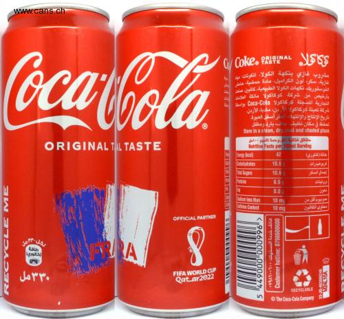 Coca-Cola =W = 1585= ORIGINAL TAL TASTE رکل ۳۳۰ مل طاقة (كالوري) ۱۳۹ ۳۳۰ مل ERRA OFFICIAL PARTNER ؟ TM FIFA WORLD CUP Qatar2022 كاكولا میاد مشروب غازي بنكهة الكولا. المكونات: مياه غازية، سكر، لون الكراميل، مادة حمضية: حامض امض الفوسفوريك، نكهات الكولا الطبيعية، كافيين، صنعت بترخيص من شركة كوكاكولا مالكة العلامات المات التجارية المسجلة كوكاكولا Coca-Cola بواسطة شركة تعبئة كوكاكولا الأردن، مادبا، الأردن. تاريخ الإنتاج والإنتهاء : أنظر أسفل العبوة. تحفظ في مكان نظيف، جاف، بارد ومظلل C/ Coke. PRISINAL 0/ | F 10: IT Prote Fat IS::: || ||| Store in a clean, dry,cool and shaded place حقائق غذائية لكل وحدة تقديم ۱۰۰مل Nutrition Facts per 100ml Serving 42 10.6 g 10.6 g 0.0 g 0.0 Energy (kcal) Carbohydrates Total Sugars Proteins Fat Sodium less than Caffeine Content 5 449000 000996 10 mg 10 mg هاتف خدمة المستهلك: 0798600600 Customer hotline: 0798600600 طاقة (كالوري) كربوهيدرات إجمالي السكر بروتينات دهون صوديوم أقل من محتوى الكافيين RECYCLABLE © The Coca-Cola Company 22-J0-403006246 M24L10A ENDAD