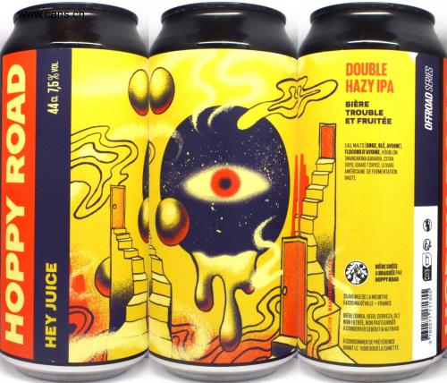 HOPPY ROAD 44 CL 7,5% VOL. HEY JUICE SPRATION MAARTENDSWDERS T DOUBLE HAZY IPA BIÈRE TROUBLE ET FRUITÉE EAU, MALTS [ORGE, BLE, AVOINE), FLOCONS D'AVOINE, HOUBLON [MANDARINA BAVARIA, CITRA CRYO, IDAHO 7 CRYO], LEVURE AMÉRICAINE DE FERMENTATION HAUTE BIÈRE CRÉÉE & BRASSÉE PAR HOPPY ROAD 26 AVENUE DE LA MEURTHE 64320 MAXEVILLE-FRANCE BIÈRE [BIRRA, BEER, CERVEZA, OL] NON FILTRÉE, NON PASTEURISÉE A CONSERVER DEBOUT & AU FRAIS À CONSOMMER DE PRÉFÉRENCE AVANT LE: VOIR SOUS LA CANETTE OFFROAD SERIES 3 760271171355