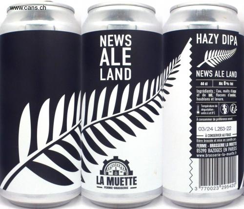 10 NEWS ALE LAND LA MUETTE FERME-BRASSERIE HAZY DIPA NEWS ALE LAND 44 cl Alc 8% Vol Ingrédients: Eau, malts d'orge et de blé, flocons d'avoine, houblons et levure. Température de dégustation: entre 6 et 8°C À consommer de préférence avant : 03/24 L263-22 À CONSERVER AU FRAIS Bière brassée et mise en canette par: FERME-BRASSERIE LA MUETTE 85390 BAZOGES EN PAREDS www.brasserie-la-muette.fr 3 "770023"295420"