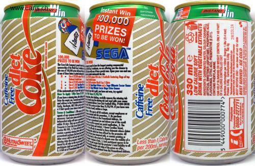 1 JR Caffeine Free 108 100 oke WWW ONUTRASWEET. BRAND SWEETENER INSTANT 10000 1000 88000 REGISTERED TRADE MARK 100000** ***** 2001 100,000 PRIZES TO BE WON The Coca-Cola Company sponsorship of the World in one of 100,000 one of these letters is If you have a winning from the empty con. 29 and address to the Promotiona Corby, Northants, NN17 NN to anim a T-Shirt specify your choice of Terms & Co agents of any company necessary. Send your name independent judge will open within 28 days. Only one Promoter is Coca-Cola London W6 9HQ., 4. Prizes contain a genuine winning promotional packages other errors will be null winning claim the promote bound by all rules on this participants shall not exceed 6.A full set of Promotional WON Instant Win 100,000 PRIZES TO BE WON! SEGA hove the longest lebrate, we are offering you the c these special pen your FIFA size 5 Footballs featuring flags of top World Cup T-Shirts Drives and a Sega Ultimate Soccer Game Soccer Mega Drive Games have not won, try again! /05/94 carefully remove the winnin winning tab and send with your name Address: Coca-Cola Football Offer, P1800 (NCH) later than 31/05/94. If you have won medium or large. to all GB residents, except employees or promotion, 2. No purchase dress to the Promotional Address. An can and inform you of the result pened per postal application., 3. The reland, 1 Queen Caroline Street, y be awarded to those doimonts whose claims has been affixed by the promoter. All 1 with, or contain printing or of a dispute over the validity of a 5. Each participant agrees to be repts that the promoter's total liability to all and value of the prizes on offer obtained from the Promotional Address. bill No purchase necessary Caffeine Free diet Coca Less than 1 Calorie per 200ml serving IT 'REGISTERED TRADE MARK 10 29 330 ml e LOW CALORIE SOFT DRINK WITH VEGETABLE EXTRACTS INGREDIENTS: CARBONATED WATER, COLOUR (CARAMEL), ARTIFICIAL SWEETENER (ASPARTAME), PHOSPHORIC ACID, FLAVOURINGS, CITRIC ACID, PRESERVATIVE (E 211). CONTAINS PHENYLALANINE. RECYCLABLE INSTANT M CAN HELP SLIMMING OR WEIGHT CONTROL ONLY AS PART OF A CALORIE CONTROLLED DIET 2W33L2A Nutrition Information per 100ml: Energy: 1.9kJ (0.4 kcal) Protein: 0.06g Carbohydrate: 0.03g Fat: Og "NutraSweet and the NutraSweet symbol are BEST SERVED-ICE COLD BEST BEFORE END-see base of can for date registered trade marks of the NutraSweet Company 5 "449000"000774"> 0800-227711 Consumer Information Freephone Service available in UK mainland only ? THE COCA-COLA EXPORT CORP. IN THE UK AT LONDON W6 9HQ. CANNED UNDER AUTHORITY OF THE COCA-COLA COMPANY BY Coca-Cola