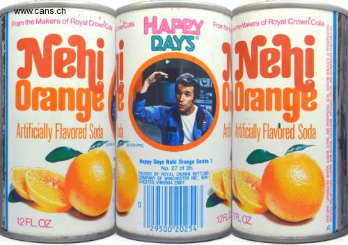 From the Makers of Royal Crown Colacown Cola Nehi Orange Artificially Flavored Soda Soda 1978 PR 12FL.OZ. HAPPY DAY'S 1978 PPC Happy Days Nehi Orange Series 1 No. 27 of 35. PACKED BY ROYAL CROWN BOTTLING COMPANY OF WINCHESTER INC., WIN- CHESTER, VIRGINIA 22601 0 29500 20254 From then the Makers of Royal Crown Cola |Nehi Orange AffArtificially Flavored Soda 12FLORFLOZ CONTAINS: CARBONATED WATER, SUGAR, CITRIC AND PHOSPHORIC ACID, SODIUM BENZOATE (A PRESERVATIVE), NATURAL AND ARTIFICIAL FLAVOR, GUM ACACIA, ESTER GUM, ARTIFICIAL COLOR, AND BROMINATED VEGETABLE OIL. A