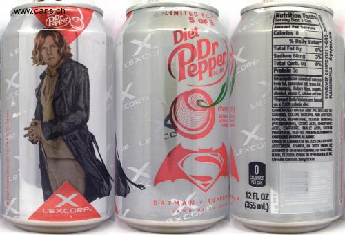 GRP 2015 Warner Bros. Ent. Inc. TM & © DC Comics LE XCO LE Diet Pepper = X LEXCORP. LE KCC P X LEXCOFF CORP EXLIMITED EDITIO 5 OF S C Diet LE CO DDr Pepper Est.1885 DAWN chemy ry NATURALIN LLY& ARTIFICIALLY CALLY FLAVORS WORED JUSTICE XCOERU CORP BATMAN V SUPERMAN LEXCOF LE: Nutrition Facts Serving Size: 1 Can Amount Per Serving Calories 0 0 CALORIES PER CAN 12 FL OZ (355 mL) Total Fat Og Sodium 60mg Total Carb. Og Protein Og % Daily Value* CONSUMER COMMENTS? 1-888-DAPEPPER PLEASE RECYCLE CARBONATED WATER AND 2% OR LESS OF. CARAMEL COLOR, NATURAL AND ARTIFICIAL FLAVORS, ASPARTAME, SODIUM BENZOATE (PRESERVATIVE), CITRIC ACID, PHOSPHORIC ACID, CAFFEINE, MALIC ACID, SODIUM PHOSPHATE, RED 40. PHENYLKETONURICS: CONTAINS PHENYLALANINE X LEXCO CANNED BY A MEMBER OF THE COCA-COLA BOTTLERS ASSOCIATION, ATLANTA, GA 30327 UNDER THE AUTHORITY OF DR PEPPER COMPANY 5301 LEGACY DRIVE PLANO, TX 75024 2016 DR PEPPERSEVEN CAFFEINE CONTENT: 39mg/1211 coz UP, INC. 6020401 RL 654 Not a significant source of calories from fat, saturated fat, trans fat, cholesterol, dietary fiber, sugars, vitamin A, vitamin C, calcium and iron. *Percent Daily Values are based on a 2,000 calorie diet. DP-90 391 0% 3% 0% drpepper.com OS$682 2015 Warner Bros. Ent. Inc.