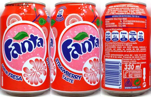 fanta S02C092 BOR FRESA STAL 819 Esta lat Energia 168 kcal 8%* Vola Cantin S Diaria * H) Fanta TRAWBERRY TASTE Ingredientes: agua carbonatada, azúcar, zumo de fresa BEBIDA REFRESCANTE AROMATIZADA. a base de concentrado, correctores de acidez E-330 y E-331, aromas, conservador E-202, estabilizadores E-414 y E-445, colorantes E-124, E-110 y E-122. INFORMACIÓN NUTRICIONAL POR 100 ml VALOR ENERGÉTICO: 215 kJ, 51 kcal GRASAS: PROTEÍNAS: HIDRATOS DE CARBONO: DE LOS CUALES AZUCARES: 12,4 g SODIO: Esta lata de 330 ml contiene Energia Azúcares 168 kcal 41 g 8% 45% un producte de The Coca-Cola Company Ug Og DE LAS CUALES ÁCIDOS GRASOS SATURADOS: Og 12,4 g FIBRA ALIMENTARIA: Grasas Sodio Og 0,02 g 0% 0% <1% de la Cantidad Diaria Orientativa para un adulto. Basado en un aporte diario de 2.000 kcal. Es recomendable seguir una dieta variada, moderada y equilibrada, así como un estilo de vida saludable. Envasado con autorización del propietario de la marca por: ver tapa. B Consumir preferentemente antes del Lote: ver la base. Proteger de la luz solar. Preservar de olores agresivos. Conservar en lugar limpio, fresco y seco. 2007 THE COCA-COLA COMPANY. 330 ml Grasas Saturadas Og 5 449000 061164 INFORMACIÓN AL CONSUMIDOR G 902 199202 D CONTINIODA RMARIT0 www.fanta.es Fanta SA PROSTOR