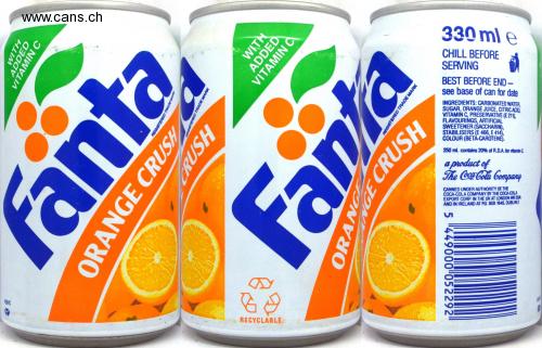 100C M WITH DED VITAMIN C Fanta ORANGE CRUSH REGISTERED DE MARK CRUSH WITH ADDED VITAMIN C GA RECYCLABLE CRUSH Fanta ORANGE 330 ml e CHILL BEFORE SERVING REGISTERED TRADE MARK BEST BEFORE END- see base of can for date INGREDIENTS: CARBONATED WATER, SUGAR, ORANGE JUICE, CITRIC ACID, VITAMIN C, PRESERVATIVE (E 211), FLAVOURINGS, ARTIFICIAL SWEETENER (SACCHARIN), STABILISERS (E 466, E 414), COLOUR (BETA-CAROTENE). 250 ml. contains 20% of R.D.A. for vitamin C. a product of The Coca-Cola Company CANNED UNDER AUTHORITY OF THE COCA-COLA COMPANY BY THE COCA-COLA EXPORT CORP IN THE UK AT LONDON W8 5SN. AND IN IRELAND AT PO. BOX 1645, DUBLIN 2 5 449000 052292