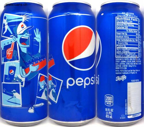 719 anday 16 pepsisi 200 CALORIES PER CAN 16 FL OZ (1 PT) 473 ml VERY LOW SODIUM, 35mg or less per 240 mL (8 fl oz). Nutrition Facts Serving Size 1 Can Amount Per Serving Calories 200 % Dally Value Total Fat Og 0% Sodium 40mg 2% Total Carbohydrate 55g 18% Sugars 55g Protein Og Not a significant source of other nutrients. *Percent Daily Values are based on a 2,000 calorie diet. CARBONATED WATER, HIGH FRUCTOSE CORN SYRUP, CARAMEL COLOR, SUGAR, PHOSPHORIC ACID, CAFFEINE, CITRIC ACID, NATURAL FLAVOR CAFFEINE CONTENT: 50mg/16 fl oz. WWW.PEPSI.COM BOTTLED UNDER THE AUTHORITY OF PEPSICO, INC, PURCHASE, MY 10577. Product questions? 1-800-433-2652 PEPSI, PEPSI-COLA and the Pepsi Globe are registered trademarks of PepsiCo, Inc. Pirst fola 001ZZ-102-0000-1711 B10041 PLEASE RECYCLE 7040207CC012