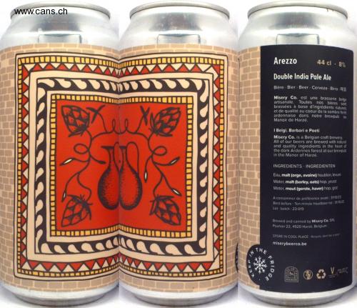 www Kele JOO X1 A IN THE Arezzo Double India Pale Ale Bière Bier Beer Cerveza Birra Misery Co. est une brasserie belge artisanale. Toutes nos bières sont brassées à base d'ingrédients naturels et de qualité au coeur de la sombre foret ardennaise dans notre brewpub au Manoir de Harzé. I Belgi. Barbari e Poeti Misery Co. is a Belgian craft brewery. All of our beers are brewed with natural and quality ingredients in the heart of the dark Ardennes forest at our brewpub in the Manor of Harzé. INGREDIENTS INGREDIENTEN Eau, malt (orge, avoine) houblon, levure Water, malt (barley, oats) hop, yeast Water, mout (gerste, haver) hop, gist A consommer de préférence avant: 31/10/23 Best before Ten minste houdbaar tot: 31/10/23 Lot batch: 23-019 Brewed and canned by Misery Co. SRL Pouhon 22, 4920 Harzé, Belgium STORE IN COOL PLACE Recycle. don't be a dick! miserybeerco.be FRIDGS GE 44 cl - 8% MA IN THE MANOR PEEL OFF TO RECYCLE