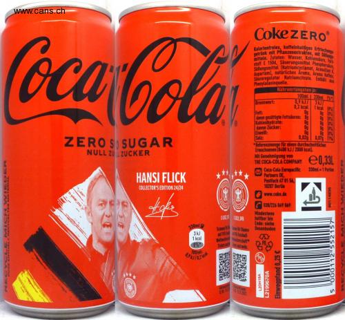 Coca-Cola MODRIM HDIN 31DADE DOSE ENTHALT RECYCELTES MATERIAL ZERO SO SUGAR NULL ZUL ZUCKER SEH 701 2525 HANSI FLICK COLLECTOR'S EDITION 24/24 #hafez 330ml 3 kJ 1 kcal 0%* 100ml: 0.9 kJ/0,2 kcal CO EUTSE ALL-BUND 02022, 02022, DFB C Scannen fen für Chance auf FIFA FIFA Fussball- Weltmeistereisterschaft Tickets and ets und mehr. STIE OLAND Aktions 12.09.-11. Stat 值 Aenetrand: -1.22.2022 Coke ZERO Kalorienfreies, koffeinhaltiges Erfrischungs- getränk mit Pflanzenextrakten, mit Süßungs- mitteln. Zutaten: Wasser, Kohlensäure, Farb- stoff E 150d, Säuerungsmittel Phosphorsäure, Süßungsmittel (Natriumcyclamat, Acesulfam K Aspartam), natürliches Aroma, Aroma Koffein, Säureregulator Natriumcitrate. Enthält eine Phenylalaninquelle. Brennwert: Nährwertangaben je: Fett: Og Og davon gesättigte Fettsäuren: Og Kohlenhydrate: davon Zucker: Eiweiß: Og Og Salz: 030/226 069 069 Mindestens haltbar bis Ende: siehe Dosenboden FA 100ml | 330ml (%) 0,9 kJ/ 3 kJ 0,2 kcal *Referenzmenge für einen durchschnittlichen Erwachsenen (8400 kJ/2000 kcal). (AMP) L2DH16A L2199670A Einwegpfand 0,25 € 1 kcal (0%) Mit Genehmigung von THE COCA-COLA COMPANY 0,33L 330ml-1 Portion Coca-Cola Europacific Partners DE. Postfach 67 01 56, 10207 Berlin www.coke.de Og 0g 0% Og (0%) Og (0% 0,02g 0,07g (1%) ↑ 60114835 000112 552157⁰ 5