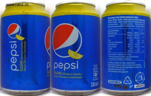 pepsi twist Mit einem frischen Hauch Zitronen-Geschmack p pepsi twis twist Mit einem frischen Hauch Zitronen-Geschmack Houch Pro 330 ml 607 kJ 143 kcal 7%* Pro 100 ml 184 kJ/43 kcal 330mle KOFFEINHALTIGES ERFRISCHUNGSGETRÄNK Zutaten: Wasser, Zucker, Kohlensäure, Farbstoff Zuckerkulör E150d, Aroma, Säuerungsmittel Phosphorsäure und Citronensäure, Säureregulator Natriumcitrat, Konservierungsstoff Natriumbenzoat, Aroma Koffein. Durchschnittliche Nährwerte pro Brennwert Fett Davon ges. Kohlenhydrate Fettsäuren Davon Zucker Eiweiß Salz %* 330 ml 330 ml 100 ml 184 kJ/ 607 kJ/ 43 kcal 143 kcal 09 09 Og 35,7 g 35,5 g Og 0,11g Og 10,8 g 10,8 g Og 0,03 g EXPORT ¹Dose enthält 1 Portion von 330 ml. *Referenzmenge für einen durchschnittlichen Erwachsenen (8400kJ/2000kcal). Mindestens haltbar bis Ende. Siehe Boden. PepsiCo Deutschland GmbH, D-63263 Neu-Isenburg. PEPSI, PEPSI-COLA and the Pepsi Globe are registered trademarks of PepsiCo, Inc. Infos & Kontakt: www.pepsi.de A AENDAVE 7% 0% 39% 2% 6092AA11A 440029694
