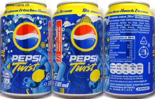 Mit einem Frischen Hauch 330 ml PEPSI Twist Kalorien 145 kcal enthalt 7% Yes Richtwertes die lageszufuh Taste... MORE! Fr ch Zitrone TE Taste... MORE! O 66 3 PEPSI Mit einem 330 ml frischen Hauch Zitrone PEPSI-COLA Twist EISKALT GENIESSEN KOFFEINHALTIGES ERFRISCHUNGSGETRÄNK. Mindestens haltbar bis Ende: Siehe Boden. Zutaten: Wasser, Zucker, Kohlensäure, Farbstoff Zuckerkulör E150d, Aroma, Säuerungsmittel Phosphorsäure und Citronensäure, Säureregulator Natriumcitrat, Konservierungsstoff Natriumbenzoat, Aroma Koffein. Nährwertangaben je 100 ml 187 kJ (44 kcal) Og Brennwert Eiweiß Kohlenhydrate Davon Zucker Fett Davon ges. Fettsäuren Ballaststoffe Natrium 11,0 g 11,0 g Og Og Og 0,01 g Fett ALU GENERUO Jede 330 ml Dose enthält: Kalorien Zucker Twist888I 145 kcal 36,3g 7% 40% 0% 0% 2% Ges. Fettsäuren Natrium 0,05g O % des Richtwertes für die Tageszufuhr (GDA) basierend auf einer Ernährung von 2000 kcal Mehr zu GDA erfahren Sie unter: www.pepsi.de PepsiCo Deutschland GmbH, D-63263 Neu-Isenburg. Mit Genehmigung der PepsiCo, Inc., Purchase, N.Y., U.S.A. EXPORT