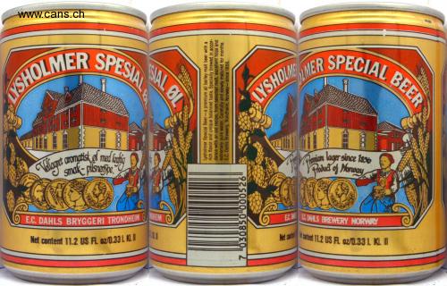 Net content 11.2 US FL. az/0.331 K. II E.C. DAHLS BRYGGERI TRONDHEIM NOHEIM Net cant content 11.2 US Fl. az/0.33 I. Kl. II NORDISKE INDUST 1 83 BUDUBLIQUE ATIONALE **OWER LED 7 030850 000526 1024 E.C. DEC. DAHILS BREWERY NORWAY TO BROCHAS EXHIGIE NO Vellagret TIONAL smak-pilsnertype, aromatisk of med kraftig YSHOLMER SPESIAL Product of Norway Premium lager since 1856 SIAL OL Lysholmer Special Beer-a premium all barley malt beer with a rich flavor and unique balanced taste. Specially brewed in accor- dance with an old recipe, from selected malt, excellent hops and extremely pure water. Carefully and slowly matured for months. E.C. Dahls Brewery, Trondheim, Norway-since 1856. LYSHOLME OLMER SPECIAL BEER