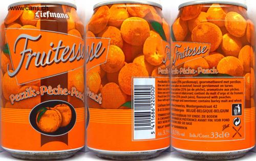 Liefmans Fruites pe Perzik-Pêche Peach 5 411686 220500 F Fructerse Perzik walk-Pache Peach Perzikenbier (25% kenbier (25% perzikensap), gearomatiseerd met perziken. Bier met suiker met suiker en zoetstof; bevat gerstemout en tarwe. Bière aux péchir aux pêches (25% jus de pêche), aromatisée aux pêches. Bière avec suce avec sucre et édulcorant; contient du malt d'orge et du froment. Peach beer (25d beer (25% peach juice), flavoured with peaches. Beer with sugar with sugar and sweetener; contains barley malt and wheat. Liefmans brev mans breweries, Wontergemstraat 42 B-8720 Dent 720 Dentergem BELGIE-BELGIQUE-BELGIUM TENMINSTE HOUD MINSTE HOUDBAAR TOT EINDE: ZIE BODEM A CONSOMMER ONSOMMER DE PRÉFÉRENCE AVANT FIN: VOIR FOND BEST BEFORE BEFORE END: SEE BASE REG.N° 100/000 100/0000099/36 Alc. 3,5% 3,5% vol Ball Inh./Cont.33cle 01