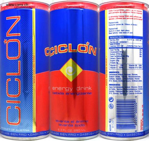 ● CON TAURINA LEVANTA TU CUERPO NO 73 CIC www.CICLON.COM CON TAURINA LEVANTA TU CUERPO C CCICLON ● E energy drink bebida energizante levanta el ánimo levanta todo 8.3 FL OZ./250 ML PRODUCT OF AUSTRIA SIRVASE BIEN FRÍO.GASEOSA SA SIRVASE BIEN FRÍO. TAURINA LEVANTA TU CUERPO Ciclón Energy Drink Blaborado en especial para períodos de esfuerzos físicos mayores! A refreshing Energy Drink with caffeine and vitamins Enhance your persons performance www.CICLON.COM. Pasteurizado. Consumir antes de: [Véase el fondo) Pasteurized. Store in a cool, dark place. Best before: (see base of can) NUTRITION FACTS Serving Size Serving per container 1 MASUNT PER DERES Calories 122 Cal Vitamin A 0% Vitamin C 50% Total Fat Og Cholesterol Omg Sodium 215mg Total Carbohydrate 28g Dietary Fibers Og Sugars 28g Protein Og 8.3 fl. oz. (250 ml) REXAM PR-3 Calories from Fat 0 0% 0% 9% 9% INGREDIENTS: Carbonated Water, Sucrose, Glucose, Sodium Citrate, Taurine, Glucuronolactone, Caffeine, Inositol, D-Pantothenol, Vitamin B12, Biotin, Artificial flavors, Artificial colors. INGREDIENTES: 8E11L08A Agua Carbonatada, Azúcar, Glucosa, Citrato de Sodio, Taurina, Glucuronolactona, Cafeina Inositol, Pantotenato de Calcio, Vitamina B12, Biotina, Sabores y Colores Artificiales. GASEOSA SRVASE BIEN FRÍO Vitamin B6 50% Vitamin B12 50% 00000 2020€ A.R. CICLON Ind-Ban J-P.B. Distributed by: GASEOSA SIRVA