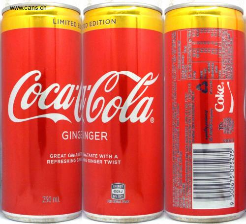 250 ml PER 250mL PACK 5% DI* 453kJ ENERGY REFRESHING GINGING GINGER TWIST GREAT Coke. TASTE TASTE WITH A GINGERINGER 2016 THE COCA-COLA COMPANY. PREPARED AND CANNED BY COCA-COLA AMATIL (AUST) PTY LTD, 102 BRIENS ROAD, NORTHMEAD NSW 2152 AUSTRALIA, UNDER AUTHORITY OF THE COCA-COLA COMPANY, OWNER OF THE TRADE MARKS 'COCA-COLA, COKE AND THE DYNAMIC RIBBON DEVICE. COLA DRINK CONTAINS: CARBONATED WATER, SUGAR, FLAVOUR, NUTRITION INFORMATION Servings per package: Serving Size: 250mL Ave. Quantity per Serving %DI per 100 ml Energy 453 kJ 5 181 kJ 108 Cal 5 43 Cal og 0 og 0 og 01 26 g 81 26 g 28 2.5 mg 0.1 saturated Carbohydrates Sugars Sodium Ⓡ%DAILY INTAKE PER SERVE IS BASED ON 1.0 mg AN AVERAGE ADULT DIET OF 8700 KJ, YOUR DAILY INTAKE MAY BE HIGHER OR LOWER DEPENDING ON YOUR ENERGY NEEDS COLOUR (1501), FOOD ACID (338), CAFFEINE. CONTAINS CAFFEINE. MADE IN AUSTRALIA FROM IMPORIED AND LOCAL INGREDIENTS, STORE IN A COOL PLACE. FOR BEST BEFORE DATE SEE BASE OF CAN. CONSUMER INFORMATION PLEASE CALL 1 800 025 123 OR WWW.COCA-COLAJOURNEY.COM.AU 9 300675 075275 a quality product of The Coca-Cola Company 13306278 Recycle 10 Coke. 10c. REFUND AT SAINT COLLECTION DEPOTS IN STATE TERRITORY OF PURCHASE Protein Fai, fofal og og 10.2 g 10.2 g LIMITED ED ED EDITION