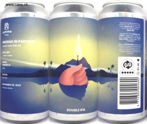 ER ALEFARM brewing INFERNO IN PARADISE Double India Pale Ale 8.0% ABV Alcohol Volume CITRA AMARILLO Hops 440 ML Can Size NOVEMBER 30, 2023 Consume Before DOUBLE IPA Brewed by Alefarm Brewing at Lunikvej 2B, DK-2670 Greve, Den- mark. alefarm.dk Øl. Indholdet svarer til 2,35 genstande. Batch 484. Ingredients: malt (barley, oat, wheat), hops, yeast, water, chit maize. Ingredienser: malt (havre, byg, hvede), humle, gær, vand, majsflager. Approx 2.78 Std Drinks. Imported to Australia by Experienceit Beverages, 15 Corrie Rd. Nth Manly NSW. 10c refund at collection depots/points in participating state/territory of purchase. Pant A 069700 2012 S