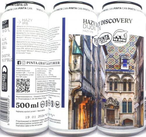 AN PINTA CAN PINTA CAN HOP RATE 18 G/L ALK. 6.5% OBJ. EKSTR. 16.5°BLO PSBR.EU PIWO M KRAFTOWE 5 904165 104434 > AAN PINTA CAN PINTA CAN PINTA CANA HAZY IPA Witajcie w chmielowym biurze podróży! Copozy! Co powiecie na wycieczkę do francuskiego Dijon? Jesion? Jeśli jesteście na tak, to zapraszamy Was z tamtejszym 90 Bantejszym 90 BPM Brewing Co. na rześkie i gęste Hazy IPA, które uw śmy z chmielami Mosaic®, Strata®, Cryo Hops Mosaic®, Mosaic® Incognito® i El Dorado Welcome to our hoppy travel agency! How abgency! How about a trip to French Dijon? If you said yes, we invite yo the local 90 BPM Brewing Co. for a crisp and for a crisp and dense Hazy IPA, which we brewed with Mosaic, Str Mosaic, Strata, Cryo Hops® Mosaic®, Mosaic® Incognito and cognito and eyes, we invite you with El Dorado® hops. y IPA, które uwarzyli- Cryo Hops HB Dorado fO PINTA.CRAFT.BERAFT.BEER 6,5% obj., Pełna lista składników pod kodem QR. / Full list of ingredients under the QR code. Piwo, alk. 6,5% ob pasteryzowane, ryzowane, niefiltrowane. Beer, alc. 6.5% vol. 6.5% vol., pasteurized, non filtered rized, non filtered. towane. Zawiera alergeny: skid alergeny: słód jęczmienny, słód owsiany stód owsiany, płatki pszeniczne, platiniczne, płatki owsiane./Contains the/Contains the allergens: malted barley : malted barley, malted oat, wheat flakes, cat fakes, oat flakes. Polska Wyprodukowano w: /Brewed in: Browar PINTA Stowar PINTA sp. z o.o., VEGAN ul. Przemysłowa 4, 34-382 Wieprz, Polska FRIENDLY 500 ml 100 efore: Najlepiej spożyć przed: / Best before: 19 01 20241241211 Przechowywać w chłodnym miejscu. Data pData przydatności jest jednocześnie numerem partii./Store in Store in cool place. Expiration date is the lot number. PINTA CAN PINTA CAN PINTA CAN PUTI HAZY DISCOVERY HAZY IPA ON PIN PINTA 90 BPM BREWING CO. 18
