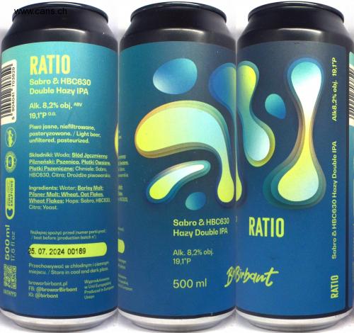 D PIWO 703829 904041 5 KRAFTOWE 500 ml 17.6 fl oz TO UNTAPPD RATIO Sabro & HBC630 Double Hazy IPA Alk. 8,2% obj. ABV 19,1°P O.G. Piwo jasne, niefiltrowane, pasteryzowane. / Light beer, unfiltered, pasteurized. Składniki: Woda; Słód Jęczmienny: Pilzneński; Pszenica, Płatki Owsiane. Płatki Pszeniczne; Chmiele: Sabro, HBC630, Citra; Drożdże piwowarskie. Ingredients: Water; Barley Malt: Pilsner Malt: Wheat. Oat Flakes. Wheat Flakes; Hops: Sabro, HBC630, Citra; Yeast. Najlepiej spożyć przed (numer partii prod.) /best before (production batch n'): 25. 07. 2024 00189 Przechowywać w chłodnym i ciemnym miejscu./Store in cool and dark place. browarbirbant.pl Wyprodukowane FB: @browarBirbant w Unii Europejskiej IG: @birbant Produced in European Union enny Owsiane. Sabro, Noworskie. Malt HBC630. i prod Mikowane Europejskiej din European B Sabro & HBC630 ) Hazy Double IPA RATIO Alk. 8,2% obj. 19,1°P 500 ml Birbant Alk8,2% obj. 19,1°P Sabro & HBC630 Hazy Double IPA RATIO