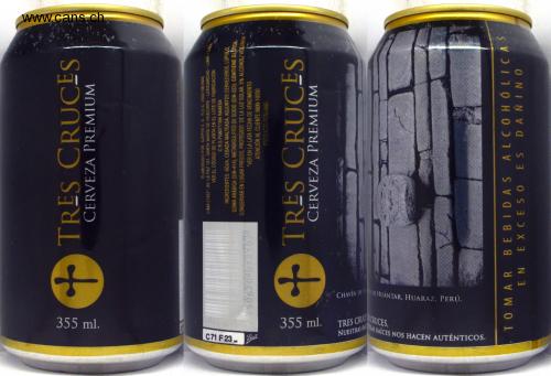 +TRES CRUCES CERVEZA PREMIUM ELABORADO POR JEPER 卡 50670 012102 ELABORADO POR AJEPER S. A. R.U.C. 20331061655 LIMA (143)*: AV. LA PAZ 131, SANTA MARÍA DE HUACHIPA-LURIGANCHO-LIMA-LIMA. VER EL CÓDIGO DE PLANTA EN EL LOTE DE FABRICACIÓN C.R.S.P5807115N NAAESA INGREDIENTES: AGUA, CEBADA MALTEADA, ADJUNTOS CERVECEROS, LUPULO, GOMA ARÁBIGA (SIN-414), METABISULFITO DE SODIO (SIN-223). CONTIENE GLUTEN CONSERVAR EN LUGAR FRESCO, PROTEGIDO DE LA LUZ SOLAR. 5% ALCOHOL/VOLUMEN *VER EN LA LATA FECHA DE VENCIMIENTO ATENCIÓN AL CLIENTE 0800-10330 PRODUCTO PERUANO +TRES CRUCES CERVEZA PREMIUM 355 ml. C71 F 23. Ball 355 ml. CHAVIN DE H TRES CRUCE DE HUANTAR, HUARAZ, PERÚ. CRUCES, NUESTRAS RARAS RAÍCES NOS HACEN AUTÉNTICOS. TOMAR BEBIDAS ALCOHÓLICAS EN EXCESO ES DANINO