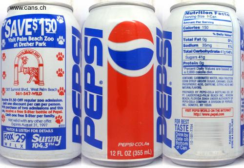 SAVE $150 Visit Palm Beach Zoo at Dreher Park PALM BEACH CH ZOO 1301 Summit Blvd., West Palm Beach, 561-547-WILD Receive $1.50 OFF regular zoo admission. Limit one discount per can per person. With purchase of two admissions and this can, receive a free 2-liter bottle of Pepsi. Limit one free 2-liter per family. Not valid with any other offer. Expires August 31, 1997 WATCH & LISTEN FOR DETAILS FOX 29 Sunny WFLX 104.3 FM #359 PEPSI Nutrition Facts Serving Size 1 Can Amount Per Serving Calories 150 % Daily Value* Total Fat 0g 0% PEPSI-COLA 12 FL OZ (355 mL) PEF Sodium 35mg 1% Total Carbohydrate 41g 14% Sugars 41g Protein Og *Percent Daily Values are based on a 2,000 calorie diet. CONTAINS: CARBONATED WATER, HIGH FRUCTOSE CORN SYRUP AND/OR SUGAR, CARAMEL COLOR, PHOSPHORIC ACID, CAFFEINE, CITRIC ACID AND NATURAL FLAVORS. PREPARED BY PEPSI-COLA BOTTLING CO. OF FT. LAUDERDALE-PALM BEACH INC., RIVIERA BEACH, FLORIDA 33404 UNDER AUTHORITY OF PEPSI-COLA COMPANY, A DIVISION OF PEPSICO, INC., SOMERS, NY 10589. VISIT PEPSI WORLD ON THE INTERNET http://www.pepsi.com FOR BEST TASTE Drink by Date on Bottom of Can 1D-101-7754 PLEASE RECYCLE STORE IN A COOL PLACE Rece With