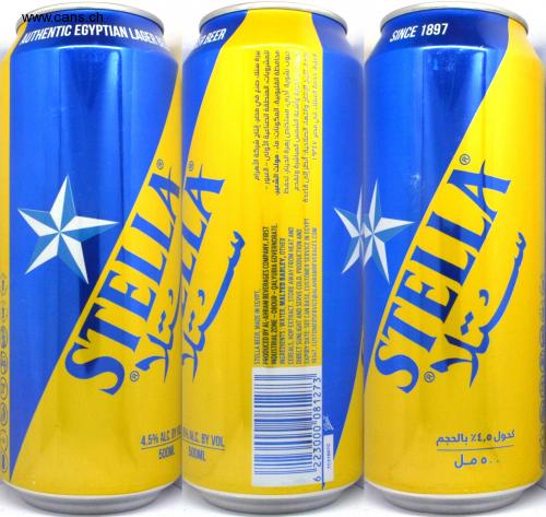 AUTHENTIC EGYPTIAN LAGER BEER STELLA LA SINCE 1897 6 "223000"081273 Ball 7C31B07C Joo.. كحول ٤,٥ بالحجم STELLA BEER, MADE IN EGYPT, PRODUCED BY AL-AHRAM BEVERAGES COMPANY, FIRST INDUSTRIAL ZONE-OBOUR-QALYUBIA GOVERNORATE. INGREDIENTS: WATER, MALTED BARLEY, OTHER CEREALS, HOP EXTRACT. STORE AWAY FROM HEAT AND DIRECT SUNLIGHT AND SERVE COLD. PRODUCTION AND EXPIRY DATE: SEE CAN BASE, CUSTOMER SERVICE IN EGYPT 19347, CUSTOMERSERVICE@ALAHRAMBEVERAGES.COM بيرة ستلا، صنع في مصر، إنتاج شركة الأهرام للمشروبات المنطقة الصناعية الأولى - العبور - محافظة القليوبية. المكونات: ماء ، مولت الشعير حبوب نشوية أخرى، مستخلص زهرة الدينار، تحفظ بعيداً عن الحرارة وأشعة الشمس المباشرة وتقدم باردة، تاريخ الإنتاج وانتهاء الصلاحية: أنظر إلى قاعدة العلبة، خدمة العملاء في مصر ١٩٣٤٧ STELLA تلا 4.5% ALC. BY 500ML 5% ALC. BY VOL 500ML