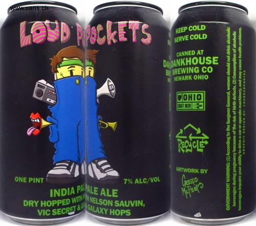 LOUD MICKETS $SERVE COLD KEEP COLD CANNED AT NEW NEWARK OHIO BR BREWING CO DANDANKHOUSE CRAFT BEER OHIO GOVERNMENT WARNING: (1) According to the Surgeon General, women should not drink alcoholic beverages during pregnancy because of the risk of birth defects. (2) Consumption of alcoholic beverages impairs your ability to drive a car or operate machinery, and may cause health problems. GRAPHIC DESIGN BY: @DUBDUBPHOTOS RECYCLE ONE PINT DRY HOPPED WITH M 7% ALC/VOL VIC SECRET&GALAXY HOPS HTH NELSON SAUVIN, INDIA PAPALE ALE CREEPS ARTWORK BY McP==PS