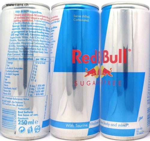 RED BULL® Sugarfree. a healthy lifestyle are recommended. normal energy ced diet and dren omen of tiredness and fatigue as well as to norma Niacin and vitamin B6 contribute to the he reduction yielding metabolism. A varied and balance content. Not recommended for children Energy Drink with sweeteners-high co caffeine or pregnant or breast-feeding women (32 mg/100 ml). Consume moderately Ingredients: Water, Acid (Citric Acid), Carbon Dioxide, Taurine (0.4%), Acidity Regulators (Sodi Carbonates, Magnesium Carbonates), Caffeine ne (0.03%), Sweeteners (Sucralose, Acesulfame Vitamins (Niacin, Pantothenic Acid, B6, B12, A Flavourings, Thickener (Xanthan Gum), Colours us (Plain Caramel, Riboflavins). Nutrition declaration per 100 ml 13 kJ (3 kcal) Energy 0 g Fat of which Saturates Og Og Carbohydrates Og of which Sugars Og Protein Salt Vitamins: Niacin Pantothenic Acid Vitamin B6 Vitamin B12 0.1 g 8 mg / 50% NRV 2 mg/33% NRV 2 mg/143% NRV 2 pg NRV = Nutrient Reference Value Red Bull GmbH, Am Brunnen 1, 5330 Fuschl am See, Austria Pasteurised. 9016 2800 /80% NRV Best before: See base of can. Content: 250 mle ที่ alu www.redbull.com redbull.com Carbon Sodium Serve chilled. Carbonated. Red Bul SUGARFREE With Taurine. Vitalizes es body and mindⓇ. Ball SEUS 06 8L33M22C NR Red Au 機