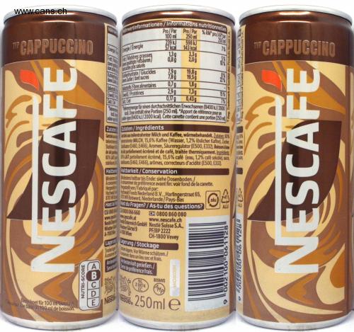 TYP TIP CAPPUCCINO CAPPUCCINO ESCA E Nährwer Energle Fett Mat davon gesig Nährwertinformationen/Informations nutritionnelles Energie/Energie Matières grasses avon gesättigte Fettsäuren ont acides gras saturés Kohlenhydrate/Glucides Pro/Par Pro/Par % RM pro/AR par 100 ml 250 ml 239 kJ 598 kJ 57 kcal 143 kcal 0,8g 7,99 19,8g 7,8g 19,5g Balaststoffe/Fibres alimentaires 0,7g 1,8g Elweld Pr Eiweiß/Protéines 2,9g 7,3g 0,17 g 0,43g Salz Se Salz Sel Referee don't actes Kohlenhy davon Zude von Zucker/dont sucres 250m 7% 15% 7% ஜீயா Reg. Trademark of Société des Produits Nestlé S.A. Reg. Trademark of Société des Produits Nestlé S.A. Referenzmenge für einen durchschnittlichen Erwachsenen (8400 kJ/2000 al. Dose enthält eine Portion (250 ml). *Apport de référence pour un adulte adulte-type (8400 kJ/2000 kcal). Cette canette contient une portion (250 ml). Zutaten Zutaten/Ingrédients Getränk a Gränk aus teilentrahmter Milch und Kaffee, wärmebehandelt. Zutaten: 80% tellentraire entrahmte MILCH, 15,6% Kaffee (Wasser, 1,2% löslicher Kaffee), Zucker, Stabilisatr Stabilisator (E460, E466), Aromen, Säureregulator (E500, E332). Boisson à base de lait parlait partiellement écrémé et de café, traitée thermiquement. Ingrédients 80% LAT 80% LAIT partiellement écrémé, 15,6% café (eau, 1,2% café soluble), sucre stabilisant abilisants (E460, E466), arômes, correcteurs d'acidité (E500, E332) Haltbarke Haltbarkeit/Conservation 80% licker, Sucre Mindestes Mindestens haltbar bis Ende: siehe Dosenboden./ A consomme Aconsommer de préférence avant fin: voir fond de la canette. Hergestel hergestellt von/Fabriqué par Hochwald 8701 WR Hochwald Foods Nederland B.V., Harlingerstraat 65, WR Bolsward, Niederlande/Pays-Bas alu 4 Hast du Hast du Fragen?/ As-tu des questions? ALU AT 0800 0800 066 660 CH 0800 860 080 www.nescafe.ch < Calue sur une base de 100 ml de boisson. Berechnet für 100 mil Getrank NUTRI-SCORE ABCDE C www.es www.nescafe.at Neste Oeste Osterreich GmbH Wiedner Gedner Gürtel 9 A-1100 W 1100 Wien Nestlé Suisse S.A., PF/BP 2222 CH-1800 Vevey Lagerung Lagerung/Stockage Trocken A conserve Am besten Servir de den lagern. Vor Wärme schützen./ conserver dans un lieu sec et frais. Am besten kalt genießen./ Servir de préférence frais. NL Z0874 EC 80584V2 AMP M4DB03BN Nest Nestle 250ml e with 891398 9 002100 061128 E ESCA