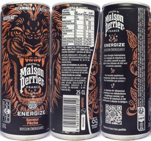 NOUVEAU VITAMINES BCAFEINE nutritionnelles FAIBLE EN CALORIES 1 portion=250 ml Informations Pour Par 1% AR** 100 ml (% AR portion par portion 52 kJ Energie 131 kJ 2% 12 kcal 31 kcal Matières grasses dont acides gras saturés 0 Glucides 3,0g 66 0g Og 0% 0% 10 7.5g 3% 7.5g 8% dont sucres 3,0g Fibres alimentaires g Og Protéines Og Og 10% Sel 10g 100 Og 0% CREATED BY Maison terrier FRANCE wwwww CREATED BY Maison terrier О Vitamine B1 (thiamine) 0,07 mg (6%) 0,17 mg 15% Vitamine B3 (niacine) 0,96 mg (6%) 2,4 mg 15% Vitamine B6 10,08 mg (6%) 10,21 mg 15% **AR: Apport de référence pour un adulte-type (8400 kJ/2000 kcal). Cette canette contient 1 portion de 250 ml. BOISSON ENERGISANTE PETILLANTE, AVEC CAFEINE ET INFUSION INTENSE DE THE VERT. ENRICHIE EN VITAMINES B1, B3 ET B6. SAVEUR PECHE. SOURCE DE VITAMINES B1, B3 ET B6. A CONSOMMER AVEC MODÉRATION DANS LE CADRE D'UNE ALIMENTATION VARIÉE, EQUILIBRÉE ET D'UN MODE DE VIE SAIN. TENEUR ÉLEVÉE EN CAFÉINE, DECONSEILLE AUX ENFANTS ET AUX FEMMES ENCEINTES OU ALLAITANTES, AINSI QU'AUX ADOLESCENTS ET PERSONNES SENSIBLES A LA CAFEINE (EN MOYENNE: 32 MG POUR 100 ML). 25 CL ENERGIZE BOISSON ENERGISANTE Testez l'énergie indomptable d'un mélange de vitamines B et de caféine, associé au goût raffiné d'une infusion de thé vert et d'arômes naturels. Une nouvelle expérience énergisante, faible en calories. Plus irrésistible que jamais ! La vitamine B1 (thiamine) contribue à un métabolisme énergétique normal. Les vitamines B3 (niacine) et B6 contribuent à réduire la fatigue. NUTRI-SCORE AB DE DC 15 CL СТРО ENERGIZE Saveur Pêche BOISSON ÉNERGISANTE 8 445291 120310" M4DC02AN (AMP) 44327215 METAL recyclable à l'infini "Boisson à base d'eau gazeifiée INGREDIENTS: EAU GAZEIFIÉE 96,3%, SUCRE, INFUSION INTENSE DE THE VERT 0,34%, ACIDIFIANT (ACIDE CITRIQUE), CAFÉINE 0,03%, VITAMINES (THIAMINE, NIACINE, B6), AROME NATUREL DE PECHE, AROME NATUREL. A CONSOMMER DE PRÉFÉRENCE AVANT FIN: VOIR SOUS LA CANETTE. A CONSERVER DANS UN ENDROIT SEC, À L'ABRI DU GEL ET DE LA CHALEUR. À BOIRE TRÈS FRAIS. SERVICE CONSOMMATEURS FRANCE: N.W.M.D., 34-40 RUE GUYNEMER 92130 ISSY-LES-MOULINEAUX. 0 806 809 997 (SERVICE GRATUIT + PRIX APPEL). MARQUE ENREGISTRÉE, UTILISÉE EN ACCORD AVEC LE PROPRIÉTAIRE DE LA MARQUE NUTRI-SCORE R CANETTE BAC DE TRI 250