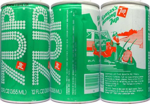 7up FLOZ ROZ (355 ML) 12 FL OZ (355655 ML) CARBONATED WATER, SUGAR, CORN SWEETENER, CITRIC ACID, SODIUM CITRATE AND NATURAL LEMON AND LIME FLAVORS PACKED BY BEVERAGE MANAGEMENT, INC., 1001 KINGSMILL PARKWAY, COLUMBUS, OHIO 43229, LICENSED BY THE SEVEN UP CO., ST. LOUIS, MO. 63105 S.O 7up Ka Tup Kansas's urning Tup CAMPING UP-THE SANTA FE TRAIL AMERICA'S TURNING 7UP. All over America people are enjoying a crisper, cleaner, more active ine and there's one taste as refreshing as this new direction America's turning to... that Kansas is turning to The taste of 7UP. CAN #16. There is one can for each state. Stack them numerically in 4 rows and see how "America's turing 7UP" Start your collection now 古