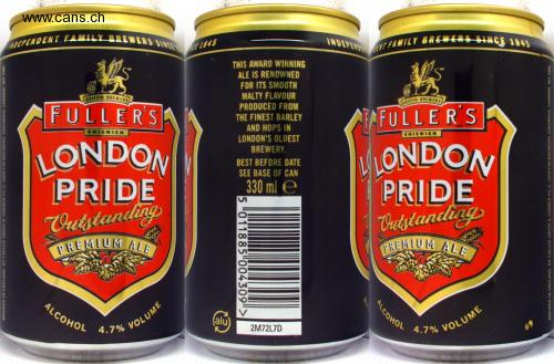 BREWED IN ENGLAND BY FULLER SMITH & TURNER PLC. GRIFFIN BREWERY, CHISWICK, LONDON, WA 208. INDEPENDENT FAMILY BREWERS SINCE GRIFFIN BREWERY FULLER'S CHISWICK LONDON PRIDE Outstanding PREMIUM ALE ALCOHOL 4.7% VOLUME CE 1845 THIS AWARD WINNING ALE IS RENOWNED FOR ITS SMOOTH MALTY FLAVOUR PRODUCED FROM THE FINEST BARLEY AND HOPS IN LONDON'S OLDEST BREWERY. BEST BEFORE DATE SEE BASE OF CAN 5 "011885 004309"> 330 ml e (alu) alt 2M72L7D INDEPENDENT FAMILY BREWERS SINCE 1845 GRIFFIN BREWERY FAFULLERS CHISWICK LONDON PRIDE Outstanding PREMIUM ALE ALE ALCOHOL 28942 4.7% VOLUME BREWED IN ENGLAND BY FULLER SMITH & TURNER PLC, GRIFFIN BREWERY, CHISWICK, LONDON, W4 208.
