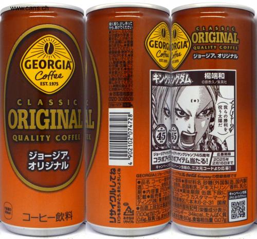 GEORGIA Coffee EST. 1975 CLASSIC C ORIGINALL QUALITY COFFEE EE ジョージア。 オリジナル 1本当り 85kcal コーヒー飲料 「軽く振り、少し待って から、あけてください ●コーヒー、ミルク成 分が固まり浮遊・沈 することがありま すが、品質には問題 ありません。 をさけてください。 容器破損・密封不良 につながります。凍 らせないでくださ い。容器破損、成分 の分離・沈殿につ ながります。缶の まま直火にかけな いでください。 温め る際は別の容器に 移しかえてくださ い。●開缶後はすぐ にお飲みください。 ★お客様相談室 0120-308509 【ジョージア 検索 リサイクルしてね いつもありがとう、またよろしくね 4 "902102 074728 0 GEORGIORGIA Coffee Coffee EST. 1975 EST. 1975 キングタングダム 45th 周年 KING CLASSIC ORIGINAL QUALITY COFFEE ジョージア ® オリジナル (•) 楊端和 ©原泰久/集英社 祝我 我らの勝利を 祝う太陽だ 応募期限 あき缶は リサイクル ジョージア×ヤングハージア×ヤングジャンプ45周年 コラボアイラボアイテム当たる! 2025年 キャンペーンキャンペーン情報の、二次元コードより応募! 2月16日まで GEORGIAとジョージアジアはThe Cox Col Company の登録商標です 品名 コーヒー飲料で飲料・原材料名 砂糖(外国製造、 国内製 金粉乳、脱脂粉乳、デキストリン/香料、乳化 250g 賞味期限 缶底下段に「 造)、コーヒー、全粉乳 剤 内容量 250g 記載 販売者 コカ・コーラカスタマーマーケ ティング(株) 東京都港 東京都港区六本木6-2-31 国産 製造所固有記号 「栄養成分表示 (100g当たり)/エネル エネルギー34kcal、たんぱく質 10.6g、脂質0g、炭水化準準 炭水化物 8.0g、食塩相当量0.07g キャンペーン情報 2ko.jp/bfth