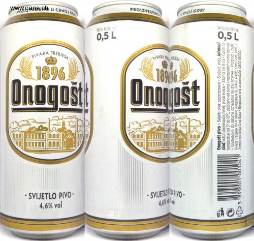 PROIZVEDENO U CRNOJ GO PIVARA TREBJESA 1896 0,5 L Neto količina: PROIZVEDENO boug ΒΕΣ . • SVIJETLO PIVO⚫ 4,6% vol . 4,6% vol SVIJETLO PO PIVO- vol PIVARA TREB TREBJESA 189096 Ono st 11.33 CRNOJ GORI Neto količina: 0,5 L . Onogošt pivo Svijetlo pivo, pasterizovano Sastojci: voda, ječmeni slad, kukuruzna krupica, hmelj, pivski kvasac Alkohol 4,6 % vol⚫Čuvati na temperaturi od 5° do 15°C, zaštićeno od sunca i neposrednih izvora toplote Upotrebljivo do datuma označenog na dnu limenke • Proizvodi i puni: Pivara Trebjesa d.o.o. Nikšić, Njegoševa 18, 81400 Nikšić, Crna Gora, MNE⚫ Zemlja porijekla Crna Gora • Besplatan broj za potrošače: 0800 83000. . E3 899001 001041 ALU