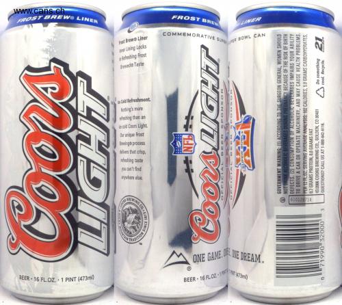 FROST BREW® LINER Coors LIGHT BEER 16 FL. OZ. 1 PINT (473ml) TRADITION TM COORS BREWING כסי• SINCE 1873 anywhere else. you can't find refreshing taste delivers that crisp, Brewing@process Our unique Frost ice cold Coors Light. refreshing than an Nothing's more Ice Cold Refreshment. BrewedⓇ Taste in Refreshing Frost Inner Lining Locks Frost BrewⓇ Liner FROST BREW COMMEMORATIVE SUPER LINER SUPER BOWL CAN NFL Coors LIGHT OFFICIAL BEER SPONSOR Ⓡ ONE GAME. ONE BEER 16 FL. OZ. 1 PINT ONE DREAM. PINT (473ml) OFFICIAL BEER SPONSOR SUPER BOWL✶ GOVERNMENT WARNING: (1) ACCORDING TO THE SURGEON GENERAL, WOMEN SHOULD NOT DRINK ALCOHOLIC BEVERAGES DURING PREGNANCY BECAUSE OF THE RISK OF BIRTH DEFECTS. (2) CONSUMPTION OF ALCOHOLIC BEVERAGES IMPAIRS YOUR ABILITY TO DRIVE A CAR OR OPERATE MACHINERY, AND MAY CAUSE HEALTH PROBLEMS. PER 12 FLOZ. SERVING AVERAGE ANALYSIS: 102 CALORIES, 5.0 GRAMS CARBOHYDRATES, 0.7 GRAMS PROTEIN, 0.0 GRAMS FAT ©2006 COORS BREWING CO., GOLDEN, CO 80401 QUESTIONS? CALL US AT 1-800-642-6116. Do something 21 cool. Recycle. MEANS 21 61012B71R 0 71990 32000' 3