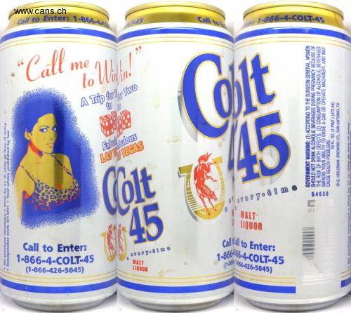No purchase necessary Sweepstakes ends 9/14/01 Must be 21 or older at time of entry Void where prohibited by law 66 Call to Enter: 1-866-4- "Call (1-866-426-5845) 1-866-4-COLT-45 Call to Enter: me LT-45 A Trip for Two to Wilia!" to W for LAS VEGAS Fabulous Colt 45 every time LIQUOR MALT Call to ter: 1-866-4-COLT-45 Colt 1645 every time LIQUOR MALT (1-800-866-426-5845) 1-866-6-4-COLT-45 Call Wall to Enter: GOVERNMENT WARNING: (1) ACCORDING TO THE SURGEON GENERAL, WOMEN SHOULD NOT DRINK ALCOHOLIC BEVERAGES DURING PREGNANCY BECAUSE OF THE RISK OF BIRTH DEFECTS. (2) CONSUMPTION OF ALCOHOLIC BEVERAGES IMPAIRS YOUR ABILITY TO DRIVE A CAR OR OPERATE MACHINERY, AND MAY CAUSE HEALTH PROBLEMS. 16 FL. OZ. (1 PINT) (473 ml) G. HEILEMAN BREWING CO., SAN ANTONIO, TX 655 54638 VF17 AM No pur Must be 21 or older at time of entry