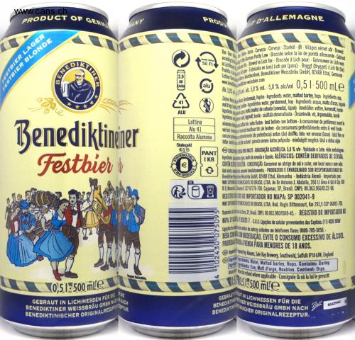 PRODUCT OF GERM ANY ESTBIER LAGER STBIER BLONDI BENE се STINER k ★ Benediktinener Festbier Imagem ilustrativa IR DIE NACH ZEPTUR 051-500 mle GEBRAUT IN LICH/HESSEN FÜR DIE BENEDIKTINER WEISSBRÄU GMBH NACH IN BENEDIKTINISCHER ORIGINALREZEPTURE 2.9 UK Units > ALU Lattina Alu 41 PRODU VIGYEL VISSZA 50 Ft alu Raccolta Aluminio Statiegeld €0,15 PANT ATEGELDRIKR € FR .E IT D'ALLEMAGNE • Bier Beer Bière Birra Cerveza Cerveja Starköl Øl Világos német sör Brewed according t • • . the German Purity Law-Brassée selon la loi de pureté allemande Gebraut in Lichen für Brewed in Lich for: Brassée à Lich pour: Gebrouwen in Lich voor: Prodotta a lidlich per: Fabricada en (em) Lich por (para): Bryggt (Brygget) i Lich for (for Lichben lee a következőnek: Benediktiner Weissbräu GmbH, 82488 Ettal, Germany. 4 "102430 075095" www.beneiner-weissbier.com . Al 5 % 5,8 % 0,51-500 mLe Zutaten: War Gerstenmalz, Hopfen - Ingredients: water, malted barley, hops-Ingrédients: eau malt d'orge hudon Ingrediënten: water, gerstemout, hop- Ingredienti: acqua, malto d'orzo, luppolo Ingredientes as agua, malta (malte) de cebada (cevada), lúpulo - Innehåller: vatten, kornmalt, humle Ingredienser van vand, bygmal, humle- sisältää ohramallasta - Összetevők: víz, árpamaláta, komló mindestens bar bis siehe Boden- best before: see bottom-à consommer de préférence avant le voir fond terminminste houdbaar tot: zie bodem da consumarsi preferibilmente entro il: vedi fondo consumir preferentemente (de preferência) antes (de) del/No. lote: ver envase (base) bäst före se botten best at the band parasta ennen katso pohjasta - minőségét megörzi: lásd a doboz alján A CERVEA PREREA PURO MALTE-GRADUAÇÃO ALCOÓLICA: 5,8 % v/v - Validade e Lote: vide embalagem. Ingredientes pistes gua, malte de cevada e lúpulo. ALÉRGICOS: CONTÉM DERIVADOS DE CEVADA CONTEN GLUTELE GLUTEN CONSERVAÇÃO: Conservar ao abrigo de sol e calor, em local seco e sem odor. Após aberto consumir imediatamente. PRODUZIDO E ENVASILHADO SOB RESPONSABILIDADE DE Benediktiner er Weissbrau GmbH, 82488 Ettal, Alemanha - Indústria Alemã. Importado por: WMB SUPERMER PERMERCADOS DO BRASIL LTDA. Av Dr Antonio J. Abdalla, 260 Lt Área A Qd A Glp 500 BI B, Mezanino ezanino B. CEP 07776-700. Cajamar, SP, Brasil. CNPJ: 00.063.960/0122-98. REGISTRO DOSTRO DO IMPORTADOR NO MAPA: SP 002041-9 • WMB SUPERMER PERMERCADOS DO BRASIL LTDA. Rod. Regis Bittencourt, Km 293,5 CEP 06882-700. Itapecerica da enterica a Sera, SP, Brasil. CNPJ: 00.063.960/0049-45- REGISTRO DO IMPORTADOR NO MAPA: SPIELP 03692-7 - C.R.C: Ligações de celular provenientes das Capitais: (11) 4020-5050 Ligações de ce celular de outras cidades ou telefones fixos: 0800-705-5050.- BEBA COMCOM MODERAÇÃO. EVITE O CONSUMO EXCESSIVO DE ÁLCOOL PROIBIDA ADA A VENDA PARA MENORES DE 18 ANOS. Ingredie GB Import ported by. Adnams, Sole Bay Brewery, Southwold, Suffolk IP18 6JW, England Ingredients: Water, Malted barley, Hops. Contains: Barley. rédients: Eau, Malt d'orge, Houblon. Contient: Orge. lean for refund where applicable-Consignée là où la loi le prescrit 05051-500 mle Return GEBRAUT IN RAUT IN LICH/HESSEN FÜR DIE BENEDIKTINEINER WEISSBRÄU GMBH NACH BENEDIKTINIS TINISCHER ORIGINALREZEPTUR. Ball 203894 5G42F04C N