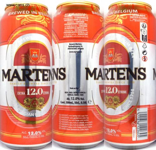 UM BREWED IN BELGI RIGINAL REWE UM BEST BEFORE: see base of can TEN MINSTE HOUDBAAR TOT: zie onderkant blik./A CONSOMMER DE PREFERENCE AVANT LE: voir fond de la boîte./CONSUMIR PREFERENTEMENTE ANTES DEL: ver fondó de la lata./CONSUMIR DE PREFERENCIA ANTES DE: ver fundo da lata./DA CONSUMARSI PREFERIBILMENTE ENTRO IL: vedi fondo della lattina./MINDESTENS HALTBAR BIS: siehe Boden der Dose. BREW RITA IN BELGIUM ORIGINAL WED LATTINA: ALU 41 RACCOLTA ALLUMINIO VERIFICA LE DISPOSIZION DEL TUO COMUNE | b ww EMB BEER Brewery Martens, Kettingbrugweg 34, 3950 Bocholt, Belgium www.martens.be MB BEER ALU Anna 1758 Plans 1758 MARTENS MARTENS FAMILY BREWERS SINCE 1758 ORIGIN EXTRA 12.0 BE TRADITIO GIANPA ME TRADIT BVB ORIGINAL GIAN HERITAG QUALITY ONIN STRONG 11758 Vente au Nige BEER/BIER/BIERE/CERVEZA/ CERVEJA/BIRRA/BIER Alc. 12.0% Vol. Cont. 500ml, 50c, 0.50Le FAMILY BREWERS SINCE 178 EXTRA 12.0 ST EVB RIGINAL QUALITY STRONG BREW ONIM 1758 SINCE N 5 411616122645 VPB24046 ALC. 12.0% VOL 50cL/500mL/0.50L EINGREDIENTS: water, barley malt, sugar, hops. INGREDIENTEN: water, gerstemout, suiker, hop FR INGREDIENTS: eau, malt d'orge, sucre, houblon. INGREDIENTES: agua, malta de cebada, azúcar, lúpolo INGREDIENTES: água, malte de cevada, açúcar, lúpolo. DINGREDIENTI: acqua, malto d'orzo, zucchero, luppolo. DE ZUTATEN: Wasser, Gerstenmalz, Zucker, Hopfen. AALC. 12.0% VOL 50CL/500mL/0.50L AMP L4GE08BN