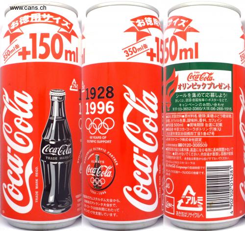C 350ml缶 +150ml TRADE MARK REGD. Coca-Cola TRADE MARK 「アルミ 1928 11996 WORLDW OU 68 YEARS OF OLYMPIC SUPPORT LDWIDE WORLD OLYMPIC PARTNER ALWAYS Coca-Cola. 1928-1996 1928年のアムステルダム大会から、 1928年の 1996 コカ・コ オリンピ 1996年のアトランタ大会まで、 コカ・コーラは68年間にわたって オリンピックを支援しています。 お徳用サイズ 350ml缶 +1550ml TRADE MARK DE MARK REGD. Enjoy Coca-Cola. オリンピックプレゼント シールを集めて応募しよう! 詳しくは、店頭・自販機等のポスターなどで。 キャンペーンのお問い合わせ 東京:03-3652-3360/ 大阪:06-268-1515 ●品名 炭酸飲料 原材料名 糖類(果糖ぶどう糖液糖、 砂糖)、カラメル色素、酸味料、香料、 カフェイン ●内容量 500ml 賞味期限 缶底に記載 ●製造者 中京コカ・コーラボトリング(株) U 名古屋市東区砂田橋四丁目1番47号 日本コカ・コーラ株式会社認定 サワヤカコーク ★消費者情報室 0120-308509 ●直射日光の当たる車内等、高温になる場所に長時間置かないで ください。●凍らせないでください。 内容液が膨張し容器が破損 する場合があります。 あき缶は車窓から投げすてないでください。 COCA-COLA COKEとコカ・コーラは The CocaCola Companyの登録商標です オリンピックの五輪マークはIOCの商標です JTS-01 JAS Coke 「アルミ あき缶はリサイクルへ 4 902102 014281 350