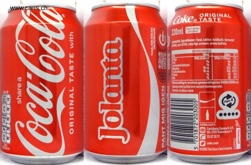 share a 330ml Energi 594 7 139kcal Fedt Og Mattede fedtsyrer 0% 35g Og ZO 16 100ml: 180kJ/42kcal ORIGINAL TASTE with Periode: 15/05-31/08 2025 Coke.dk/shareacoke Coke Serveres 330ml afkølet ORIGINAL TASTE Laskedrik. Ingredienser: Vand, sukker, kuldioxid, farvestof (E1500), syre (E338), naturlige aromaer, aroma koffein. PER: NÆRINGSINDHOLD 330ml (%) 594kJ/139kcal (7%) O 100ml 180kJ/42kcal Energi Fedt: Og (%0) 60 heraf mættede fedtsyrer: Og Og (0%) Kulhydrat: 10.6g 35g (13%) heraf sukkerarter: 10.6g 35g (39%) SCAN MIG G Protein: 06 VIND ENE PREME Og (%0) 60 Salt: Og Og (0%) PANT MIG IGEN JEG ER IKKE AFFALD JEG SKAL GENANVENDES Bedst før: Se dåsens bund. *Referenceindtag for en voksen gennemsnitsperson (8400kJ/2000kcal). Opbevares tørt og ikke over normal stuetemperatur. 5 701872 203005 Ener Pant A 5940 139 1 60 Mattede fedtsyre coke.com Carlsberg Danmark A/S. DK-1799 København V 33 27 33 77 coke.com Sukkerarte 35g S2025 The Coca-Cola Company 16D51BF06A 339962 345 1800 JAGG