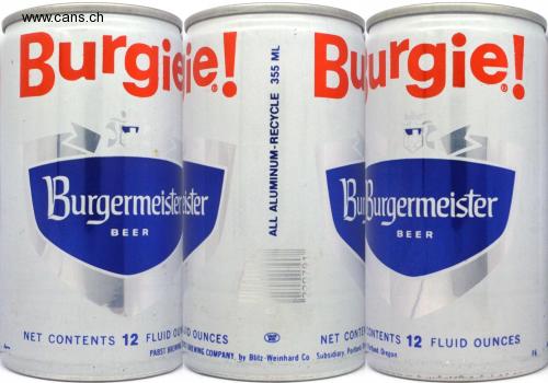 t Burgie! Buurgie! Burgerme BEER ALL ALUMINUM-RECYCLE 355 ML BuBurgermeister BEER 220791 NET CONTENTS 12 FLUID OUND OUNCES PABST BREWING T UNION MAD NET CONTUNTENTS 12 FLUID OUNCES GST BREWING COMPANY, by Blitz-Weinhard Co. Subsidiary, Portland Portland, Oregon F6