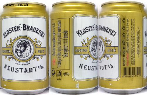 KLOSTER KLOSTER BRAVERE! SCHUTZ-MARKE NEUSTADT BIER אה 18 רב คำเตือน : "ห้ามจำหน่ายสราแก่เด็กอายุต่ำกว่า 18 ปี" : * การดื่มสุราทำให้ความสามารถในการขับขี่ยานพาหนะลดลง ต่ำกว่า 18 ปี ไม่ควรดื่ม เด้ก U BOV 6HTH KLOSTERBRAUERE KLOSTER SCHUTZ-MAR MARKE BIER NEUSTADT D. SERVE COOL AT: 45°F 50°F/8°C -10°C ans 330 au³/alc. 5.2% vol. UNDER LICENCE AND CLOSE SUPERVISION FROM KLOSTER BRAUEREI NEUSTADT A/D. BREWED AND CANNED BY PATHUMTHANI BREWERY CO.,LTD. PATHUMTHANI, THAILAND 8850999 171210 KLOST