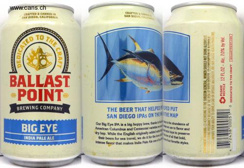 CRAFTED & CANNED IN SAN DIEGO, CALIFORNIA SAN DIEGO, CALIFORNIA DEDICATED TO THE CRAFT CRAFTED&CANNED IN BALLAST POINT BREWING COMPANY BIG EYE INDIA PALE ALE E THE BEER THAT HELPED PELPED PUT SAN DIEGO IPAS ON THE MATHE MAP | Our Big Eye IPA is a big hoppy brew, thanks to theks to the abundance of American Columbus and Centennial varieties we use ees we use to flavor and dry hop. While the English originally added extra hoped extra hops to preserve their beers for sea travel, we do it for the love of the love of all that bold, intense flavor that makes India Pale Ale one of our one of our favorite styles. 72438 00051 0 DEDICATED TO THE CRAFT BALLAST POINT.COM GOVERNMENT WARNING: (1) ACCORDING TO THE SURGEON GENERAL, WOMEN SHOULD NOT DRINK ALCOHOLIC BEVERAGES DURING PREGNANCY BECAUSE OF THE RISK OF BIRTH DEFECTS. (2) CONSUMPTION OF ALCOHOLIC BEVERAGES IMPAIRS YOUR ABILITY TO DRIVE A CAR OR OPERATE MACHINERY, AND MAY CAUSE HEALTH PROBLEMS. PLEASE RECYCLE 12 FL.OZ - Alc. 7.0% by Vol. 9