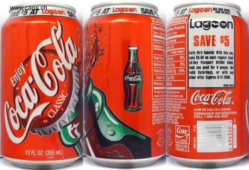 SAVE $5 AT Lageen SA Enjoy ca-Cola CLASSIC G 12 FL OZ (355 mL) $5 AT Lageen SAVES Coca-Cola VERY LOW OR LESS PER PANEL FOR DETAILS 65 AT Lageon St Lagoon SODIUM 35 mg PER 240 ml (8 fl oz) Nutritionrition Facts Serv. Size 10 Size 1 Can Amount Per Seri Per Serving Calories 14 is 140 Total Fat % Daily Value* 0% Fat 0g Sodium 50m 50mg 2% Total Carb Carb 39g Sugars 39 Sugars 39g Protein Og ein Og 13% *Percent Daily Vat Daily Values are based on a 2,000 on a 2,000 calorie diet. CARBONATED WATERED WATER, HIGH FRUCTOSE CORN SYRUP AND ORP AND/OR SUCROSE, CARAMEL COLOR, COLOR, PHOSPHORIC ACID, NATURAL FLAVORS FLAVORS, CAFFEINE. CANNED UNDER AUTNER AUTHORITY OF THE COCA-COLA COMPANY COMPANY, ATLANTA, GA BY SWIRE COCA-COLLOCA-COLA, USA, SALT LAKE CITY, UTTY, UTAH 84020 PLEAS RECYC CYCL Coke CLASSIC SAVE $5 Early Bird Special: With this can, save $5.00 on each regular Adult All-Day Passport BEFORE NOON. Each can good for 6 people. Not valid Saturdays, or with any other offer. Expires 9-17-2000. ORIGINAL FORMULA 2000-0028 Coca-Cola ©1999 THE COCA-COLA COMPANY CONSUMER INFORMATION CALL 1-800-438-2653 1999-2472 12 OZ OE 0 496340 6 0 04 22 B 1 MD