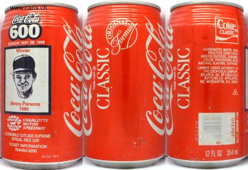 Coca-Cola 600 SUNDAY, MAY 29, 1988 Winner Benny Parsons 1980 CHARLOTTE MOTOR SPEEDWAY OLDSMOBILE CUTLASS SUPREME OFFICIAL PACE CAR TICKET INFORMATION 704/455-3200 87-CLC-181A Trade-mark R CLASSIC ORIG Formula ca Trade-mark ® CLASSIC 228 AB 15 12 FL OZ 354 ml Coke CLASSIC CARBONATED WATER, HIGH FRUCTOSE CORN SYRUP AND/OR SUCROSE, CARAMEL COLOR, PHOSPHORIC ACID NATURAL FLAVORS, CAFFEINE CANNED UNDER AUTHORITY OF THE COCA-COLA COMPANY ATLANTA, GA. BY COCA-COLA BOTTLING CO. AFFILIATED, INC. MORGANTON, N.C. 28655 496340 ALL-ALUMINUM CAN OLD