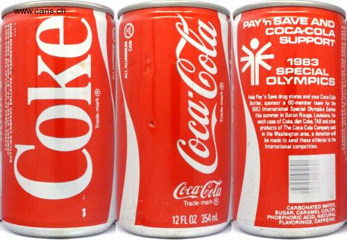429-C CANNED UNDER AUTHORITY OF THE COCA-COLA COMPANY, ATLANTA, GA., BY PACIFIC COCA-COLA BOTTLING COMPANY, BELLEVUE, WASHINGTON 98005 000 00 Trade-mark ALL-ALUMINUM CAN Trade-mark R PAY'n SAVE AND COCA-COLA SUPPORT 1983 SPECIAL OLYMPICS 009 900 000 40 242 CANNED UNDER AUTHORITY OF THE COCA-COLA OMPANY ATLANTA CATUDY PAC Y PACIFIC COCA-C Help Pay 'n Save drug stores and your Coca-Cola Bottler, sponsor a 60-member team for the 1983 International Special Olympics Games this summer in Baton Rouge, Louisiana. For each case of Coka, diet Coke, TAB and other products of The Coca-Cola Company sold in the Washington area, a donation will be made to send these athletes to the International competition. Coca-Cola Trade-mark® 12 FL OZ 354 ml CARBONATED WATER, SUGAR, CARAMEL COLOR, PHOSPHORIC ACID, NATURAL FLAVORINGS, CAFFEINE