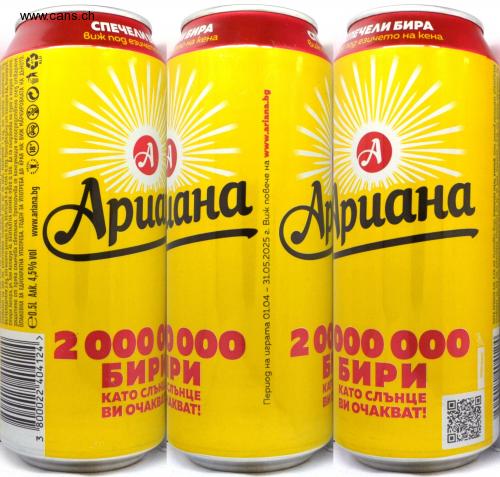 3 800022 404124 > SRPA АРИАНА ААК 45% vol състав: вода, в стойност на 100 ml ЕНЕРГИЙНА СТОЙност 153 kJ/ 36 kcal, МАЗНИНИ < 0.1g, oт кoйтo наситени од. ВЪГЛЕХИДРАТИ 2.89, om koumo zaxapu 0.19, БЕЛТЪЦИ 0.4 9. СОЛ < 0.019. Произведено от Загорка АД, България, стара загора, ул. Хан Аспарух 41. БЕЗПЛАТНА ЛИНИЯ: 0800 11 330. Да се съхранява на сухо и хладно място, защитено от пряка слънчева светлина. Препоръчва се консумация непосредствено след отваряне. ОПАКОВКА ЗА ЕДНОКРАТНА УПОТРЕБА. ГОДЕН ЗА УПОТРЕБА ДО КРАЯ НА: ВИЖ МАРКИРОВКАТА НА Дъното. 0.5L АлK. 4,5% Vol www.ariana.bg ENJO 18+) ( ALU СПЕЧЕЛИМ Busk nog eзuem то на кена GHPA подана БИР РИ 20000000 ВИ ОЧАКВА КАТО СЛЪНИ AKBAT! СЛЪНЦЕ Период на играта 01.04 - 31.05.2025 г. Виж повече на www.ariana.bg N Buk A ВИ ОЧАКВАТ! КАТО СЛЪНЦЕ БИРИ 200000 000 20951403С Ball под езичето на кена МЕЧЕЛИ БИРА БИРА АРИАНА АЛК 4,5% vol. Съставku: Boga, ечемичен малц, ечемик, хмел, хмелов екстрakm. ХРАНИТЕЛНА МАЗНИНИ стойност на 100 ml ЕНЕРГИЙНА СТОйност 153 / 36 keat 010