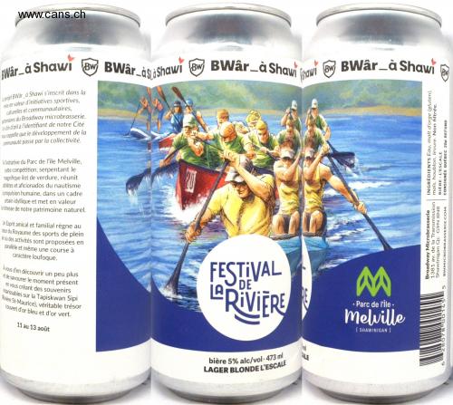 ras Shawi Bw BWâr_à Shawi nawil BW BWâr_à Shaw War à Shawi Bw BWar_d Le projet BWar à Shawi s'inscrit dans la mise en valeur d'initiatives sportives, culturelles et communautaires, partenaires du Broadway microbrasserie. Un clin d'oeil à l'identifiant de notre Cité nous rappelle que le développement de la communauté passe par la collectivité. À l'initiative du Parc de l'île Melville, cette compétition, serpentant le magnifique ilot de verdure, réunit athlètes et aficionados du nautisme à propulsion humaine, dans un cadre urbain idyllique et met en valeur la richesse de notre patrimoine naturel. Un Esprit amical et familial règne au cœur du Royaume des sports de plein air où des activités sont proposées en parallèle et même une course à caractère loufoque. Avous d'en découvrir un peu plus et de savourer le moment présent en vous créant des souvenirs intarissables sur la Tapiskwan Sipi Rivière St-Maurice), véritable trésor couvert d'or bleu et d'or vert. 11 au 13 août DE FESTIVAL RIVIERE B . Parc de l'île. Melville [SHAWINIGAN ] bière 5% alc/vol. 473 ml LAGER BLONDE L'ESCALE CALE 628078 00145 5 Broadway Microbrasserie 1381 av. de la Transmission Shawinigan Qc G9N 8N8 BWMICROBRASSERIE.COM INGRÉDIENTS Eau, malt d'orge (gluten), maïs, houblon, levure. Non filtrée. BIÈRE: L'ESCALE CONSIGNÉE QUÉBEC 20¢ REFUND