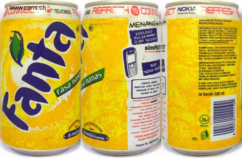 COUNVECT TELKOMSEL E (N COME ECT REFRECH OISEL NOKIA REFRESH CONNECTING PEOPLE WIN Pineapple FLAVOR DRINK CARBONATE 100,000 NUTRITIONAL VALUE INFORMATION, Serving Amount 330m Number of Servings, per pack 1, Quantity per Sa Energy 190kcal, Total Fat Og (0% RDA" Sodium 20mg (1% RDA), Total Carbs 49g(15% RDA), 49g Sugar, Og Protein (0% RDA % RDA percent Adequacy Rate Gtd based on a 2000 calorie diet simPATI PULSE @RP. 50.00 simPATINT No Compromise Ph COMPOSITION: CARBONATE WATER, SUGAR, BEVERAGE BASE FANTA INCLUDING SITAMIN PRESERVATIVE TARTRAZINE DYE BENZOATE CL NO. 19140 & YELLOW FCF CL NO. 15985 500 nand taste sd pineapple MANUFACTURED BY PT. COCA-COLA BOTTLING INDONESIA - CIBrrUNG 17520 - INDONESIA UNDER AUTHORITY THE COCA-COLA COMPANY, OWNER OF THE "FANTA" TRADEMARK. MD 550010042349 NOKIA 310000 HOW TO WIN SMS the right code FIND ON THE BALK TUT © 2002 THE COCA-COLA COMPANY PRODUCTION CODE & WELL USED BEFORE: LOOK AT THE BASE OF THE CAN 2653TH CAN Net Content 330 ml USER slmPATT AND UNIQUE AUDITORS QUALITY PRODUCT FROM SMS as big as RP. $50 DAR The Coca-Cola Coa Cola Champagne PRIZE WINNER HALAL For more information see more posters lebith Ministry of Social Affairs No. 029PSN20 between PRODUCT B L92266 8