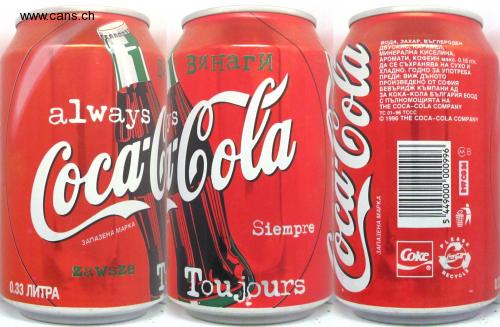 FRAGRANCES, CAFFEINE max. 0.15 g / l. WATER, SUGAR, CARBON ABYOKNC, KAL AMEN, MINERAL ACID, Always TO BE STORED DRY AND COLD. SUITABLE FOR USE BEFORE: SEE the bottom MANUFACTURED BY SOFIA BEVERAGE COMPANY AD ABOUT COCA-COLA BULGARIA EOOD with the authority of THE COCA-COLA COMPANY TC 01-96 TCCC @ 1996 THE SOSA-SOLA COMPANY always Coca-Cola M8 Always TRADE MARK Coke CocaCola forever Toujours 033 LITERS ECYCLE 966000 00067 TRADE MARK